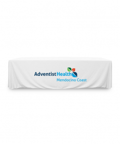 8 ft. Premium PolyKnit throw table cover with one color logo. Fits a 96 inch wide x 30 inch deep table. All corners are rounded meaning they will not gather and lay on the floor. Floor length on 4 sides. This cloth requires no ironing, is EasyCare machine washable and dryer safe.