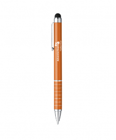 Aluminum Twist Action Ballpoint; Bold Enamel Color Finish; Shiny Silver Top, Clip, Pen Tip And Decorative Multiple Band Accents; Capacitive Soft Rubber Stylus Keeps Your Screen, Fingerprint Free! Comes With Black Ink. Complies with Prop 65. 2 1/4" W