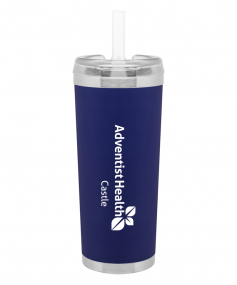 24 oz double wall 18/8 stainless steel thermal tumbler with copper vacuum insulation, stainless steel rim and base, threaded Eastman Tritan lid, snap closure, straw opening, and flexible wide silicone straw.