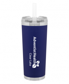 24 oz double wall 18/8 stainless steel thermal tumbler with copper vacuum insulation, stainless steel rim and base, threaded Eastman Tritan lid, snap closure, straw opening, and flexible wide silicone straw.