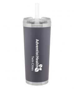 24 oz double wall 18/8 stainless steel thermal tumbler with copper vacuum insulation, stainless steel rim and base, threaded Eastman Tritan lid, snap closure, straw opening, and flexible wide silicone straw.