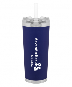 24 oz double wall 18/8 stainless steel thermal tumbler with copper vacuum insulation, stainless steel rim and base, threaded Eastman Tritan lid, snap closure, straw opening, and flexible wide silicone straw.