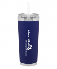 24 oz double wall 18/8 stainless steel thermal tumbler with copper vacuum insulation, stainless steel rim and base, threaded Eastman Tritan lid, snap closure, straw opening, and flexible wide silicone straw.