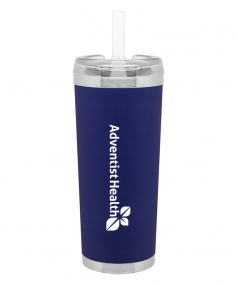 24 oz double wall 18/8 stainless steel thermal tumbler with copper vacuum insulation, stainless steel rim and base, threaded Eastman Tritan lid, snap closure, straw opening, and flexible wide silicone straw.