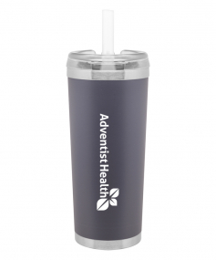 24 oz double wall 18/8 stainless steel thermal tumbler with copper vacuum insulation, stainless steel rim and base, threaded Eastman Tritan lid, snap closure, straw opening, and flexible wide silicone straw.