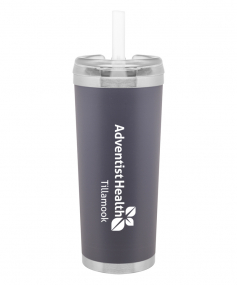24 oz double wall 18/8 stainless steel thermal tumbler with copper vacuum insulation, stainless steel rim and base, threaded Eastman Tritan lid, snap closure, straw opening, and flexible wide silicone straw.