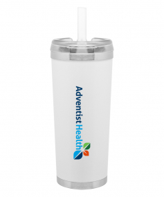 24 oz double wall 18/8 stainless steel thermal tumbler with copper vacuum insulation, stainless steel rim and base, threaded Eastman Tritan lid, snap closure, straw opening, and flexible wide silicone straw.