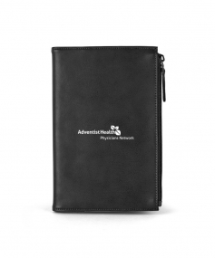 Stylish executive notebook with PU/split leather outer and suede inner cover. Features large zipper pocket (fits up to iPhone 7S Plus). Includes 80-sheet replaceable notebook. 5 3/4" H x 8 1/2" H