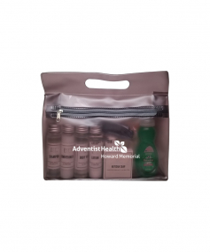 It's always the little things that are forgotten that are hard to find at your new place. We packed all the essentials into one handy tote. EST Shampoo, Conditioner, Body Wash, Lotion & Hand Soap, Old Spice and Dove Deodorants, Toothbrush, Colgate Toothpaste, Whispermint Mouthwash, Brush/Comb, Band Aids, Advil packet, Emergen-C Drink Packs, Alka Seltzer, Baby Wipes, Cotton Balls/Qtips, Tide Laundry Packet and Palmolive Dishwashing Soap. 9 1/2" W x 8" H x 2 3/4" D
