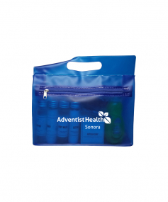 It's always the little things that are forgotten that are hard to find at your new place. We packed all the essentials into one handy tote. EST Shampoo, Conditioner, Body Wash, Lotion & Hand Soap, Old Spice and Dove Deodorants, Toothbrush, Colgate Toothpaste, Whispermint Mouthwash, Brush/Comb, Band Aids, Advil packet, Emergen-C Drink Packs, Alka Seltzer, Baby Wipes, Cotton Balls/Qtips, Tide Laundry Packet and Palmolive Dishwashing Soap. 9 1/2" W x 8" H x 2 3/4" D