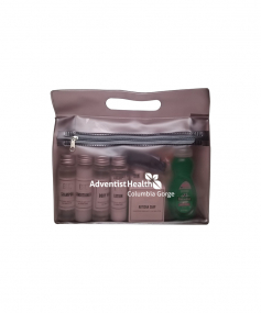 It's always the little things that are forgotten that are hard to find at your new place. We packed all the essentials into one handy tote. EST Shampoo, Conditioner, Body Wash, Lotion & Hand Soap, Old Spice and Dove Deodorants, Toothbrush, Colgate Toothpaste, Whispermint Mouthwash, Brush/Comb, Band Aids, Advil packet, Emergen-C Drink Packs, Alka Seltzer, Baby Wipes, Cotton Balls/Qtips, Tide Laundry Packet and Palmolive Dishwashing Soap. 9 1/2" W x 8" H x 2 3/4" D