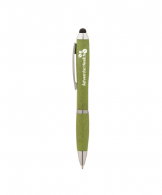 The Olivia Twist-Action Plastic Ballpoint Pen is made from a 50/50 blend of renewable wheat straw, which is the stalk left over after the harvest of wheat grains and ABS plastic. It has chrome trims, a metal clip and a capacitive stylus for touch screen devices. This pen makes a great eco-conscious gift and writes in black ink.