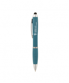 The Olivia Twist-Action Plastic Ballpoint Pen is made from a 50/50 blend of renewable wheat straw, which is the stalk left over after the harvest of wheat grains and ABS plastic. It has chrome trims, a metal clip and a capacitive stylus for touch screen devices. This pen makes a great eco-conscious gift and writes in black ink.