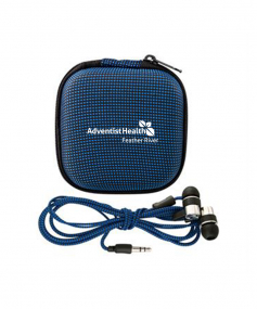 Molded textured case with zipper closure. Includes matching Braided Ear buds. Complies with Prop 65. 3.25" L x 3.25" H x 1.25" W