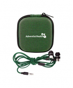 Molded textured case with zipper closure. Includes matching Braided Ear buds. Complies with Prop 65. 3.25" L x 3.25" H x 1.25" W
