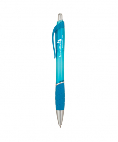 The Wave plunge-action ballpoint pen has a translucent hourglass barrel design and black ink. It has a matching color clip and rubber grip and chrome accents.